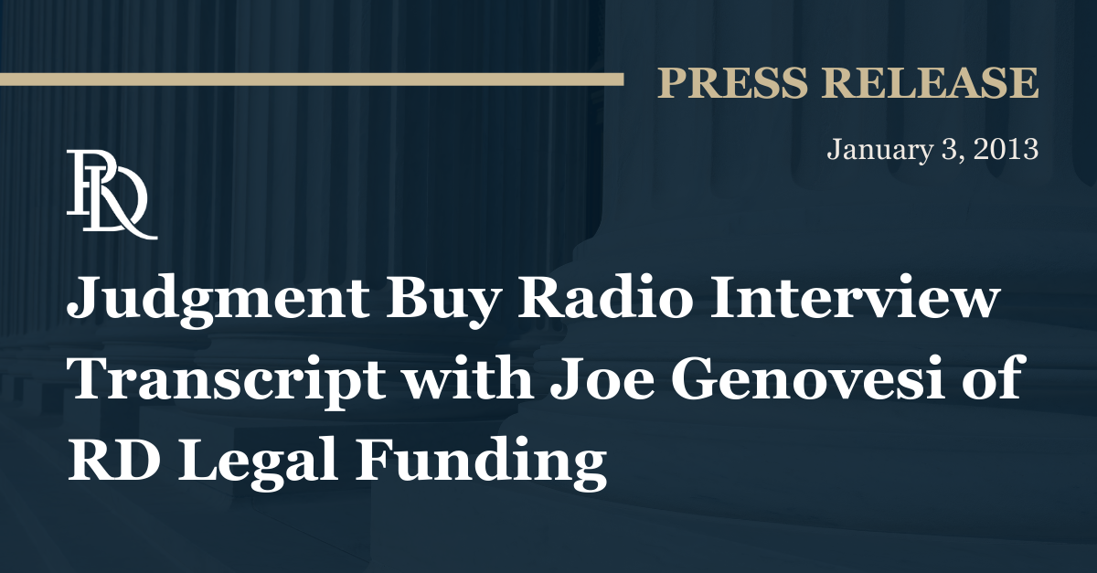 Mark Shapiro is a judgment broker based in California and is the host of the Judgment Buy Radio Show, also based in California. He interviewed Joe Genovesi, Senior Vice President of RD Legal Funding for the December 16th, 2012 edition of the Judgment Buy Radio Show. Below is the transcript.