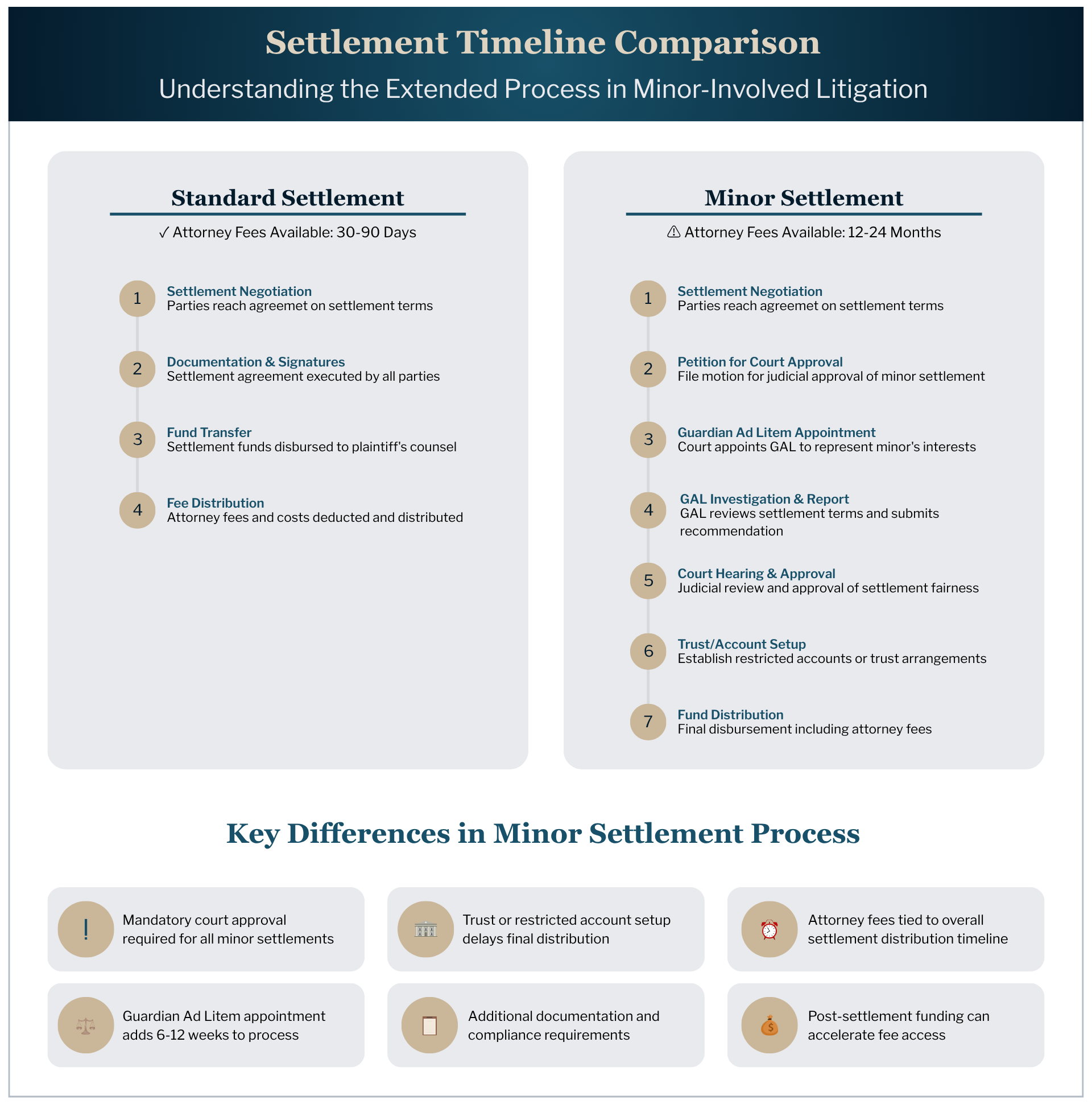 Settlement agreements involving minors require court approval to become legally binding, triggering multiple levels of protective measures that can extend fee collection timelines by as much as 12 months and occasionally longer. Following settlement negotiations, counsel must file petitions for judicial approval, undergo hearings to assess settlement fairness, and often work with court-appointed Guardian Ad Litem representatives who independently evaluate terms and advise on fund management.
