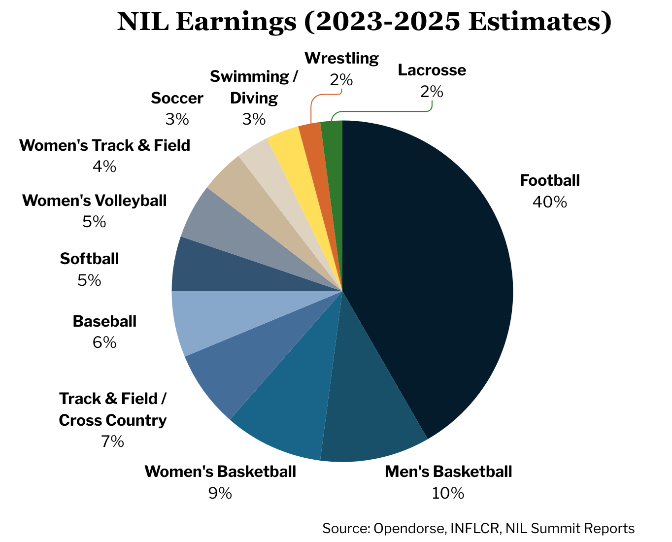 This distribution reflects historical NIL earnings concentration. Football accounts for approximately 40% of all NIL dollars, men's basketball represents 10%, and women's basketball comprises 9%, with the remaining 41% distributed across 21 other sports.